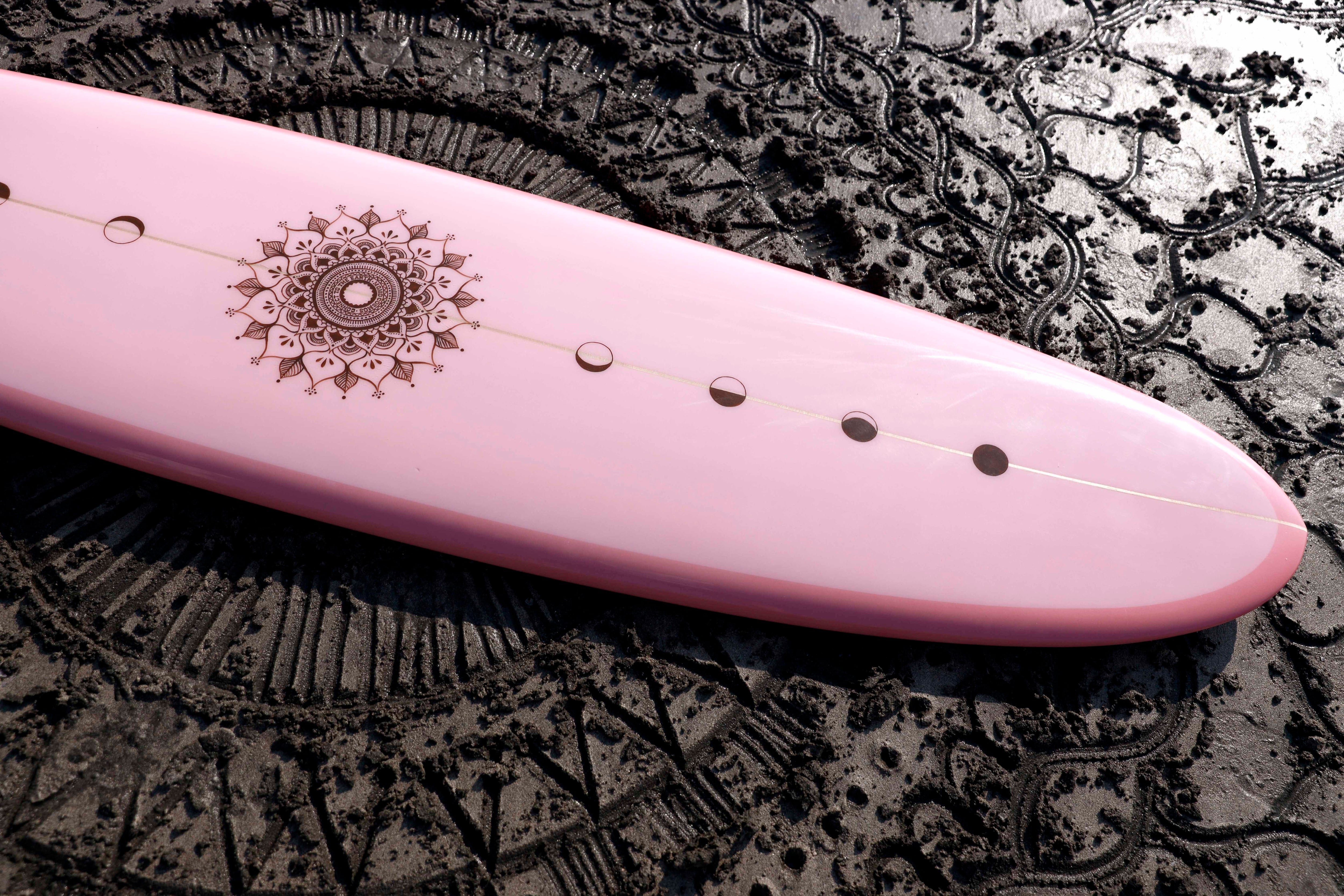 屋久島のシェイパー、レジェンドサーファーのTerry Shinoharaによるハンドシェイプしたボードに、momo cosmos 秋山祥子の「大地とコネクト」から生まれた砂絵曼荼羅がデザインされたサーフボードです。